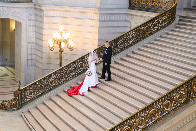 When choosing a San Francisco city hall wedding photographer, it is important to make sure you hire an expert. As a native San Franciscan with over 20 years of experience as a highly rated professional wedding photographer, Mike is uniquely qualified to cover your SF City Hall nuptials and elopement. Our professional bridal Stylist, Bianca joins Mike at most weddings to assist with all aspects of your special day at San Francisco City Hall. Bianca is also fluent in Spanish, so feel free to book us if that would be helpful to you. Se habla espanol! If Bianca is unavailable, you will be helped by our new Assistant Photographer, Estefany. No matter what wedding photography options you select, we will help make your elopement at San Francisco city hall fun and memorable. Your final wedding pictures are most important, but you also want a nice experience on your City Hall Wedding day. It's your day, make it memorable and fun and let us help!